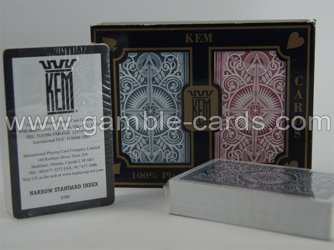 Kem jouer aux cartes avec des marqueurs luminescents sont spécialement conçus pour une performance impressionnante! 100% plastique Cartes Kem sont utilisés aujourd'hui est complètement en matière d'acétate de cellulose, les cartes à jouer en plastique durable. Kem est la seule carte de jeu qui offre la pression classique et la sensation du papier, la durabilité inégalée et des fonctions de sécurité de plastique. Porter et la casse. Les cartes Kem sont également entièrement lavable.